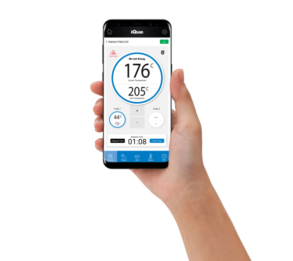 Z natančnim digitalnim krmiljenjem (PID), Wi-Fi in Bluetooth povezljivostjo, dvema merilnima sondama za meso in integrirano mobilno aplikacijo Broil King®, lahko vse faze peke nadzorujete kar s pametnim telefonom. Velik prikazovalnik omogoča hitro branje temperature in izbiro med tremi prednastavljenimi načini: dimljenje, posredna in neposredna peka.