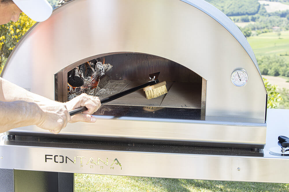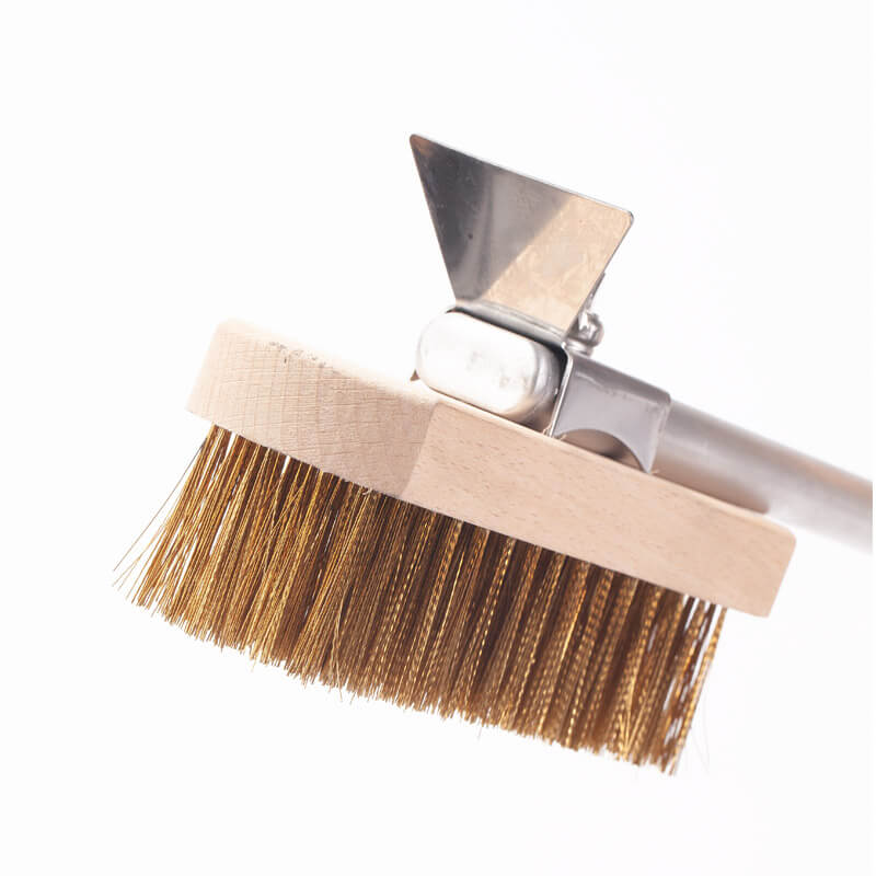 - Ščetka z medeninastimi ščetinami – učinkovita za čiščenje kuhalne površine, brez poškodovanja šamota. Ročaj iz eloksiranega aluminija nudi varno in udobno uporabo.