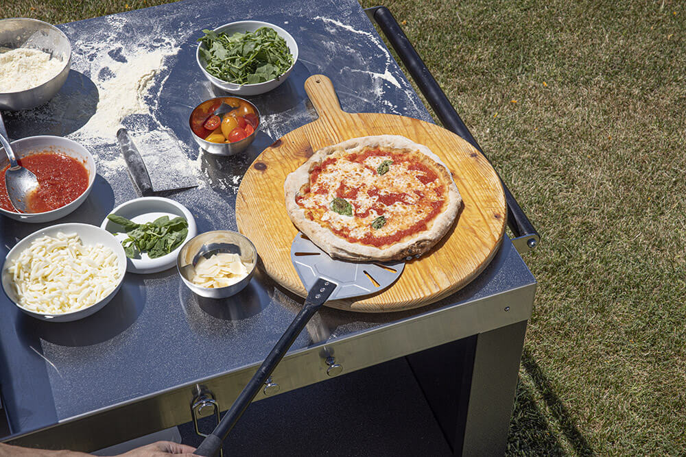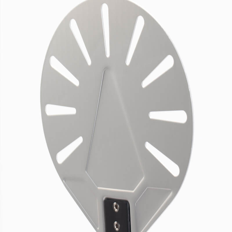 - Okrogli palino (round peel) – okretno in natančno orodje za obračanje pice v peči, preverjanje zapečenosti spodnje strani ter varno odstranjevanje iz pečice.