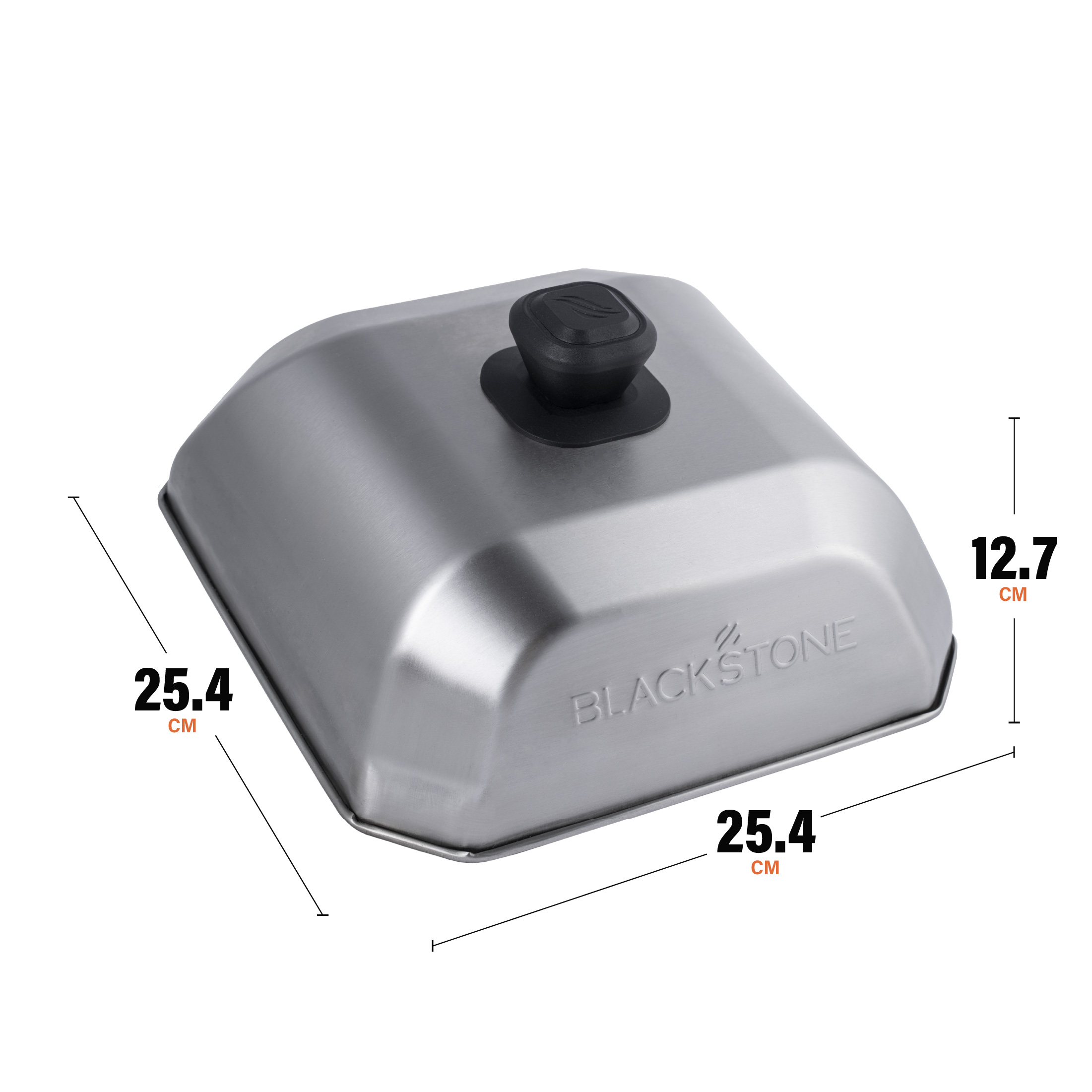 Blackstone srednja kvadratna kupola ustvari zaprt toplotni prostor na plinski žar plošči, zato se sir stopi hitreje in bolj enakomerno, zelenjava pa se skuha nežno in ostane sočna. Kvadratna oblika dobro pokrije večji del porcije (npr. burger s prilogo ali Philly “cheesesteak”), konstrukcija iz nerjavečega jekla zagotavlja dolgo življenjsko dobo, toplotno odporen ročaj pa varno rokovanje tudi pri visokih temperaturah. Po uporabi jo preprosto odloži v pomivalni stroj.