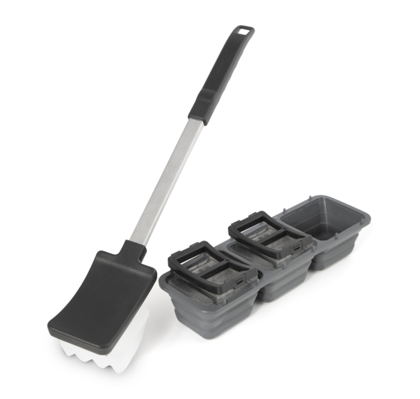 Ledena krtača za žar – inovativno čiščenje brez kemikalij! Ta edinstvena krtača uporablja led za temeljito odstranjevanje ostankov hrane in maščobe s površine rešetk. Hitro izparevanje vode odstrani umazanijo, dodatek limoninega soka pa deluje kot naravni razmaščevalec. Vključuje 3 držala za led in pladenj s 3 bloki.