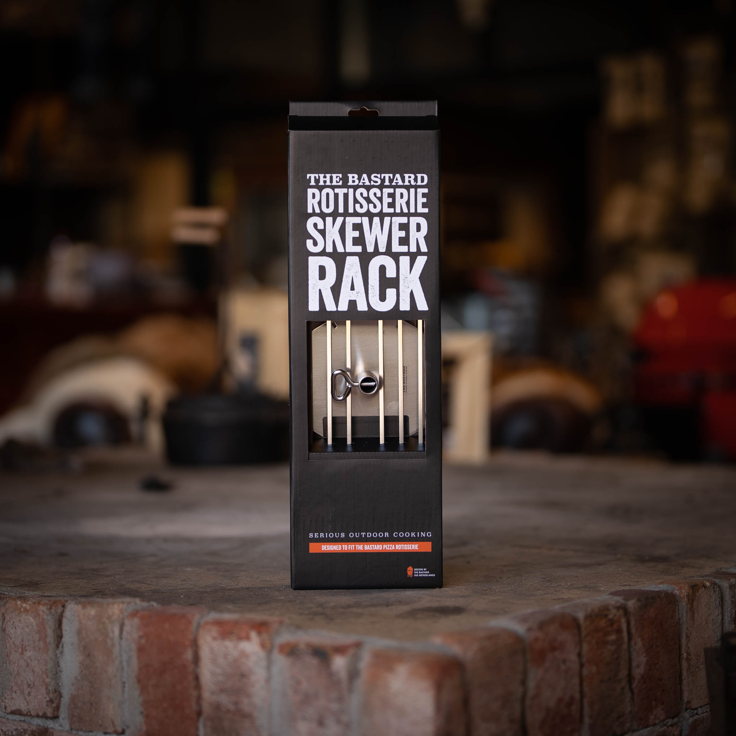 The Bastard Rotisserie Skewer Rack je visokokakovosten nerjaveči nosilec za ražnjiče, zasnovan za uporabo z The Bastard Pizza-Rotisserie Large. Omogoča enakomerno pečenje ražnjičev brez potrebe po ročnem obračanju, kar zagotavlja sočne in popolno pečene jedi. Zaradi svoje konstrukcije iz nerjavečega jekla je izdelek trpežen in enostaven za čiščenje.